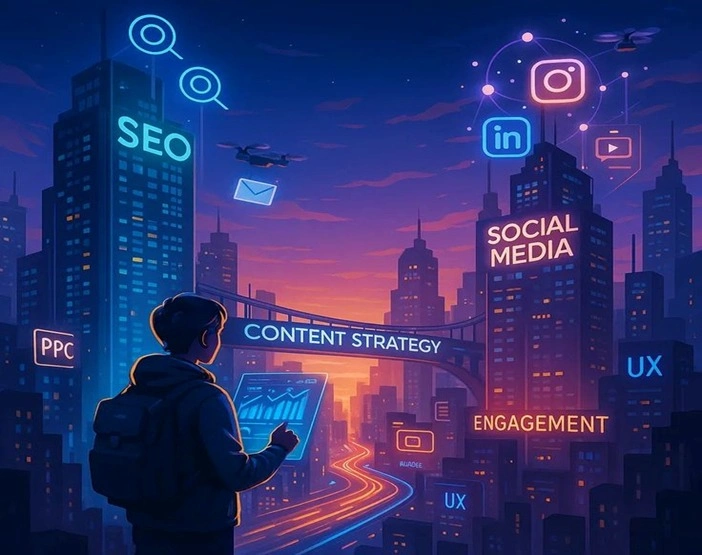 Digital marketing is the application of online platforms like search engines, social media, websites, email, and paid advertising for the purpose of promoting goods or services. It assists companies to connect with the right people, boost their brand’s awareness, get prospects, and monitor their performance in real time.